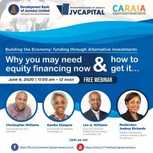 KINGSTON, June 2nd, 2020: – The Development Bank of Jamaica, through its Jamaica Venture Capital Programme (JVCAPITAL), in collaboration with the Caribbean Alternative Investment Association (CARAIA), will host its first in a series of webinars titled Building the Economy: with funding through Alternative Investments, on Tuesday, June 9 at 11:00 to 12 noon. The series will focus on exploring the Alternative Investments asset class as a financing tool to grow businesses and the Jamaican economy.